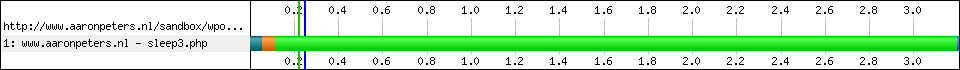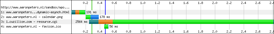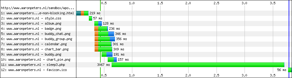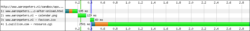 And that is not 100% true. I did several tests with his demo page in many browsers and found out that in IE8 - but not in IE7 (!?) - the main page onload is blocked on first visit (empty cache), but not on subsequent visits (primed cache). I saw the same results on my own little test page. Conclusion: this technique will often not have the desired effect in IE8, a popular browser. Too bad!